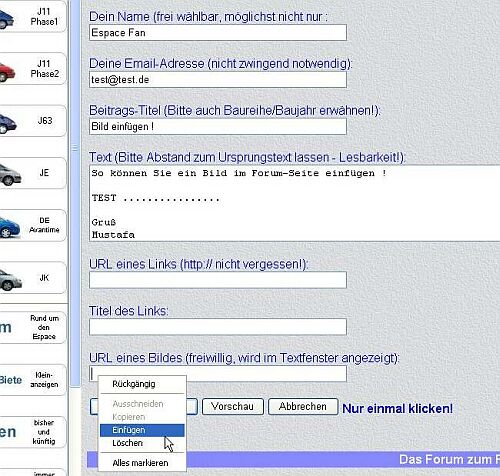 Das weisse Balken unterhalb der " URL eines Bildes(freiwillig, wird im Textfenster angezeigt):" mit rechte Maustaste anklicken und einfügen. Als nächstes wie gewohnt den Beitrag erstellen und Testen (Vorschau).