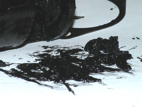 EGR Ventil nach dem Ausbau. EGR ist voellig mit dicken, zaehen Ablagerungen bedeckt. Pfeil zeigt ca. 7 Millimeter dicke Ablagerungen, die anscheinend das Schliessen des EGR beeintraechtigt haben.. |